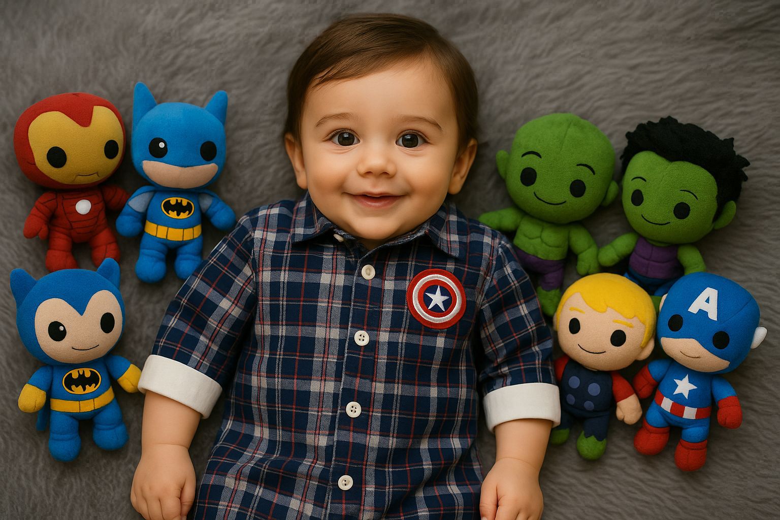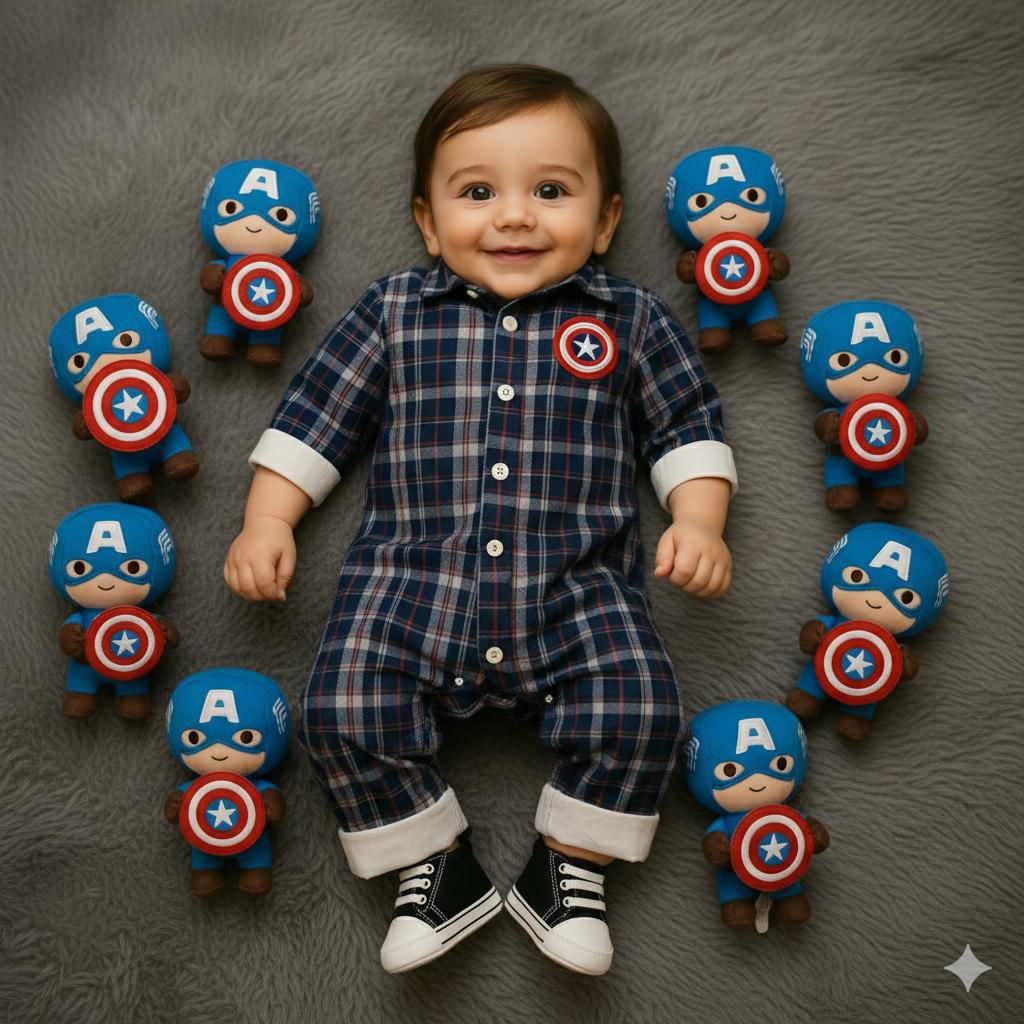 A stylish and cozy outfit for your little champion! This one-piece plaid jumpsuit features a classic blue and white pattern with a collared, button-down front and adorable folded cuffs. The best part is the cute star/shield chest patch, giving it a fun, heroic twist. Made from soft, comfortable fabric, it’s perfect for playtime, casual outings, or a themed photoshoot.