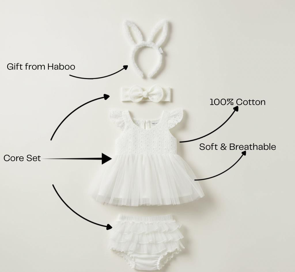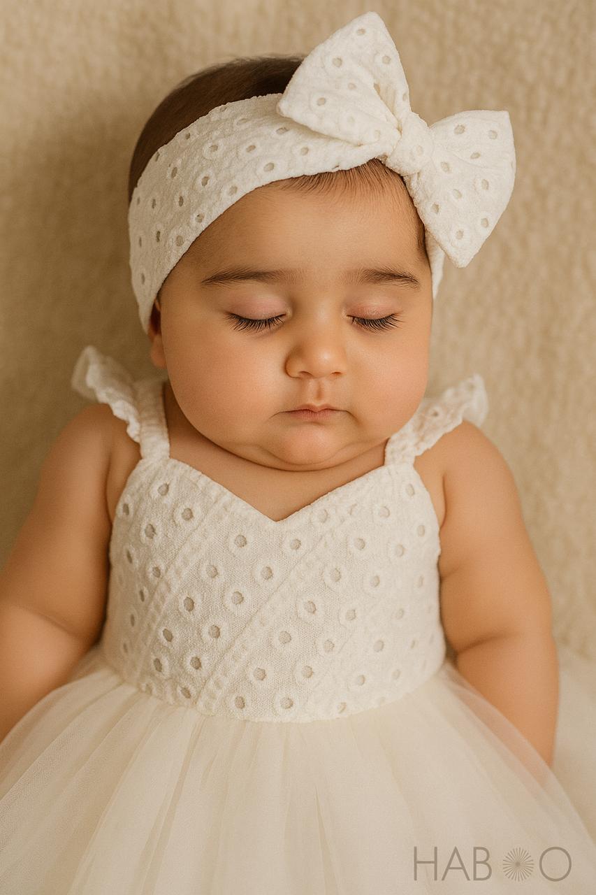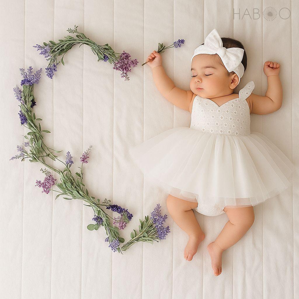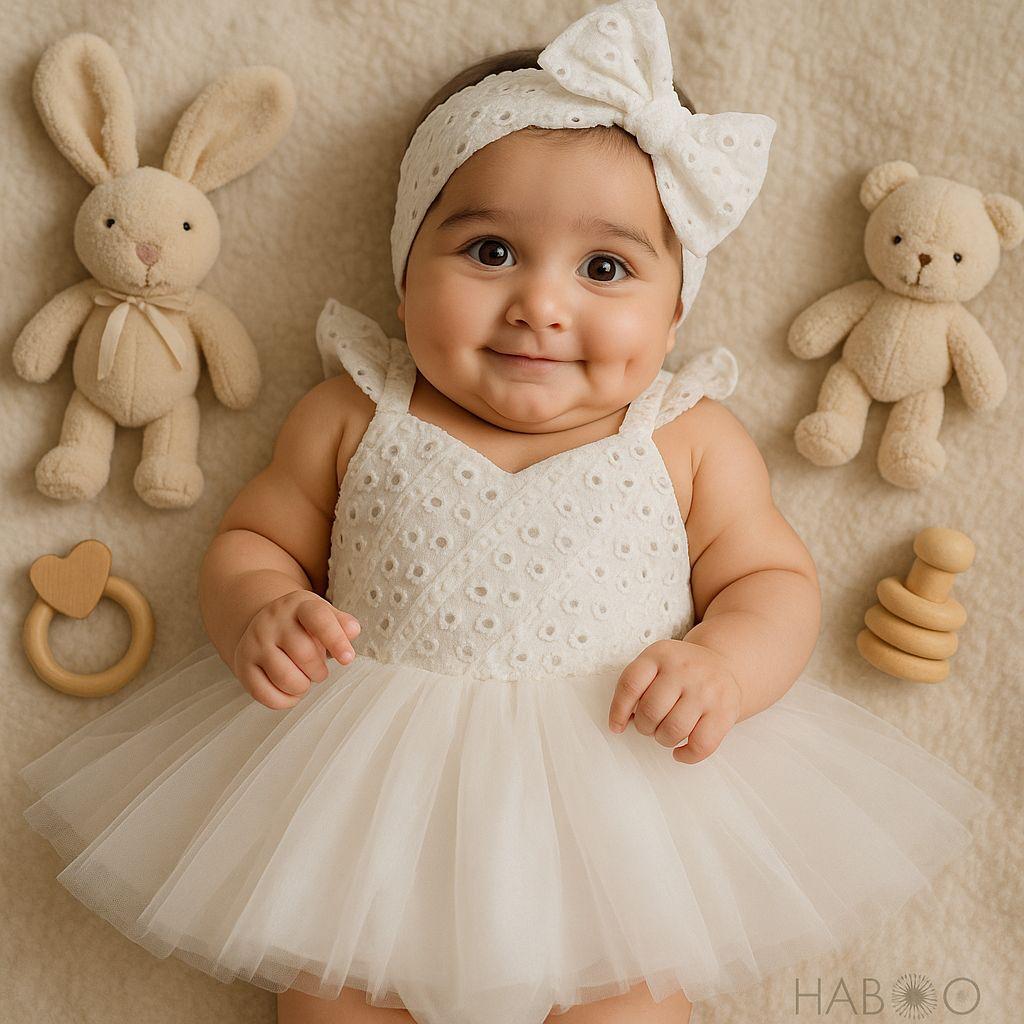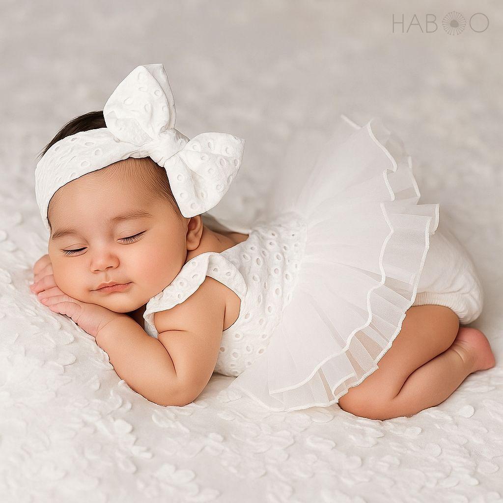 A charming outfit perfect for photoshoots, parties, or everyday cuteness! This set includes a white, textured eyelet romper with ruffled straps and a delicate, flowing tutu skirt overlay. Complete the look with the matching bow headband. Soft, comfortable, and undeniably sweet.
